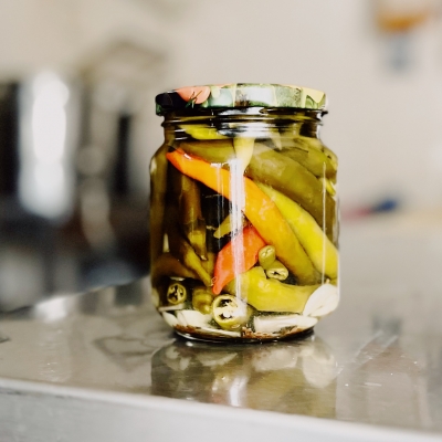 Стеклянная банка - 0,5л. Степень остроты - больше средней, в зависимости от жгучести перца.