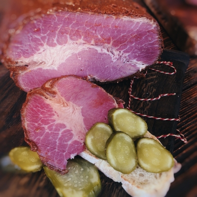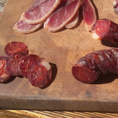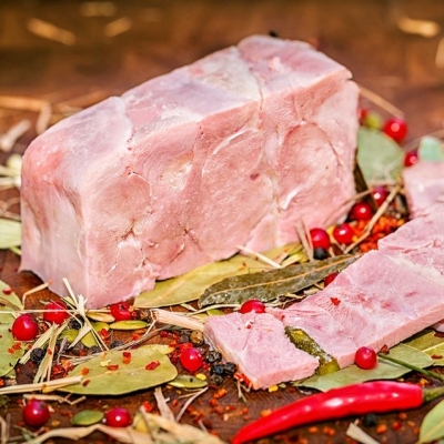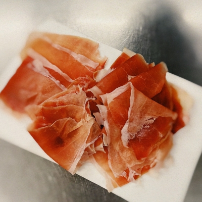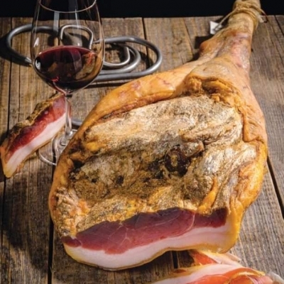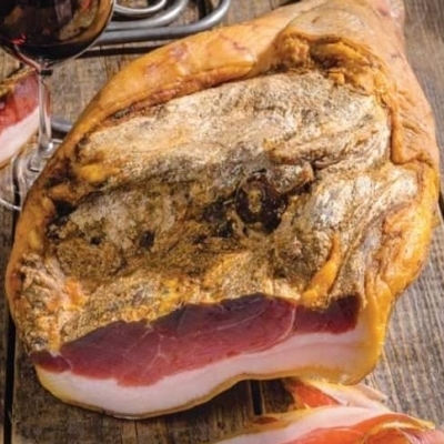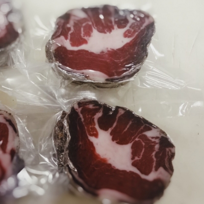 Кусочки провесного сыровяленого свиного окорока, выдержка 24 мес. Упаковано в вакуум. Вес упаковок - 200-480 гр.